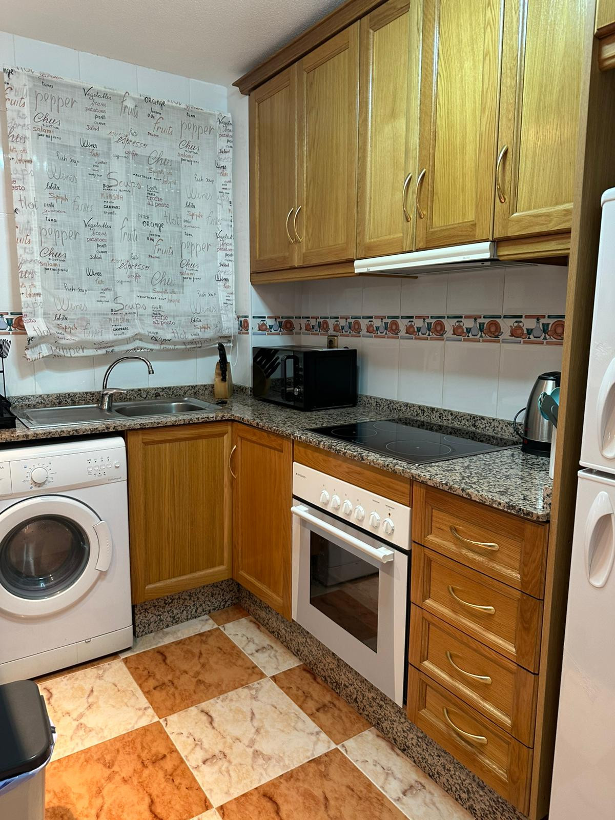 The open-plan kitchen, with ceramic hob, is equipped with fridge, microwave, oven, freezer, crockery/cutlery, utensils/kitchen and kettle.